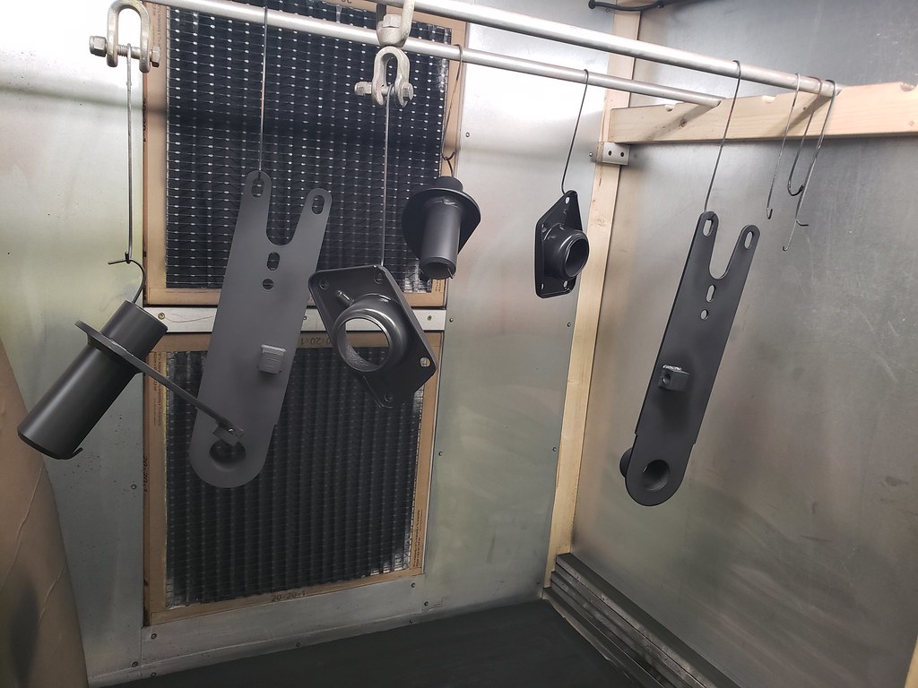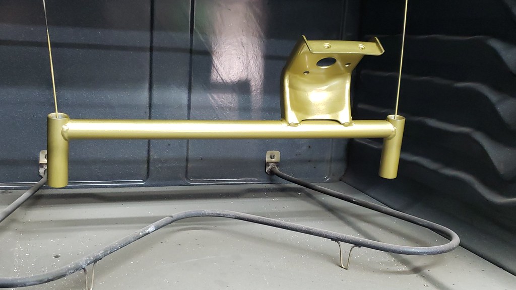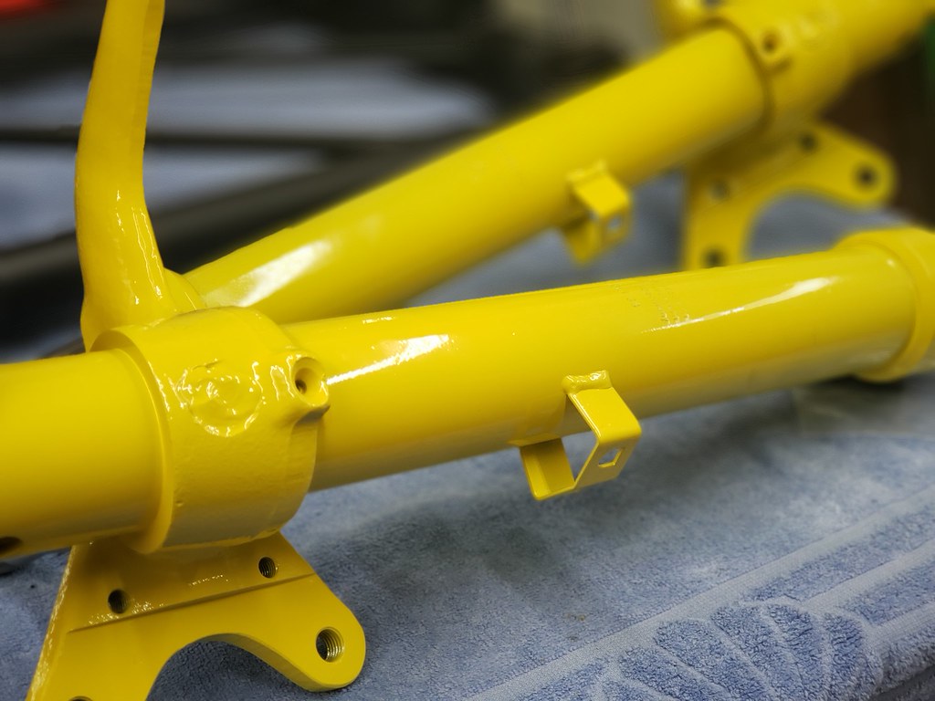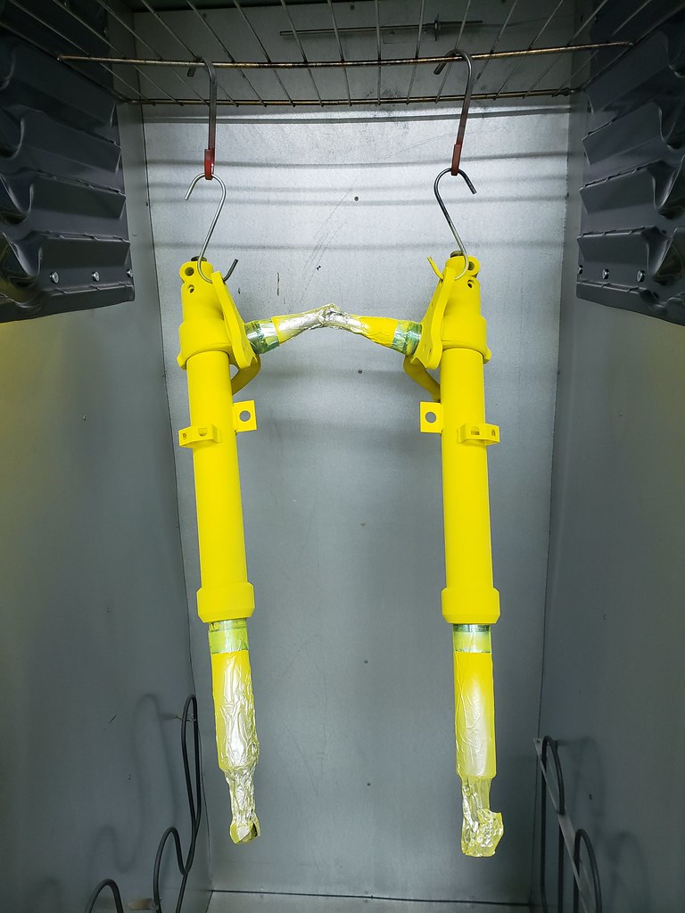Original the struts are green like a John Deer Tractor, but I like to have them Bilstein Yellow. Since I still had some of the correct color powder, I powder coated them yellow.