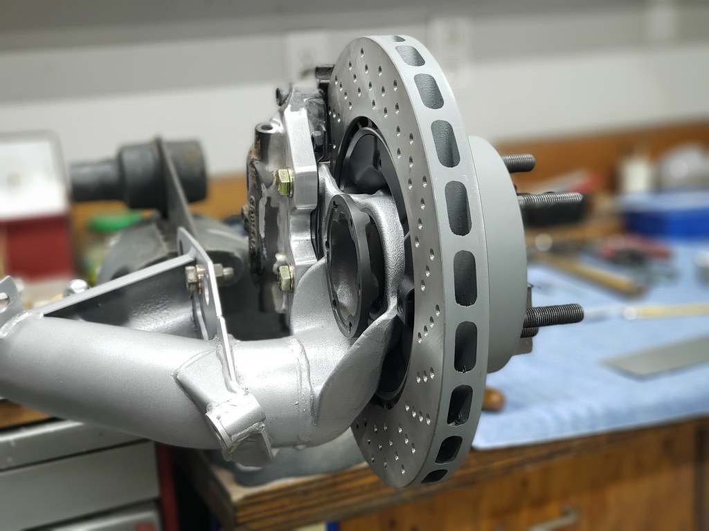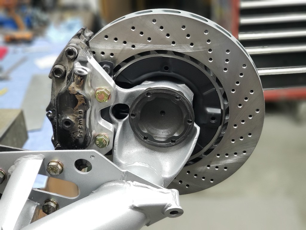 Next I started on the upgrade for the rear brake system. I use 964 calipers. The rear calipers were modified to fit the rear mounting of the 911 banana arms.