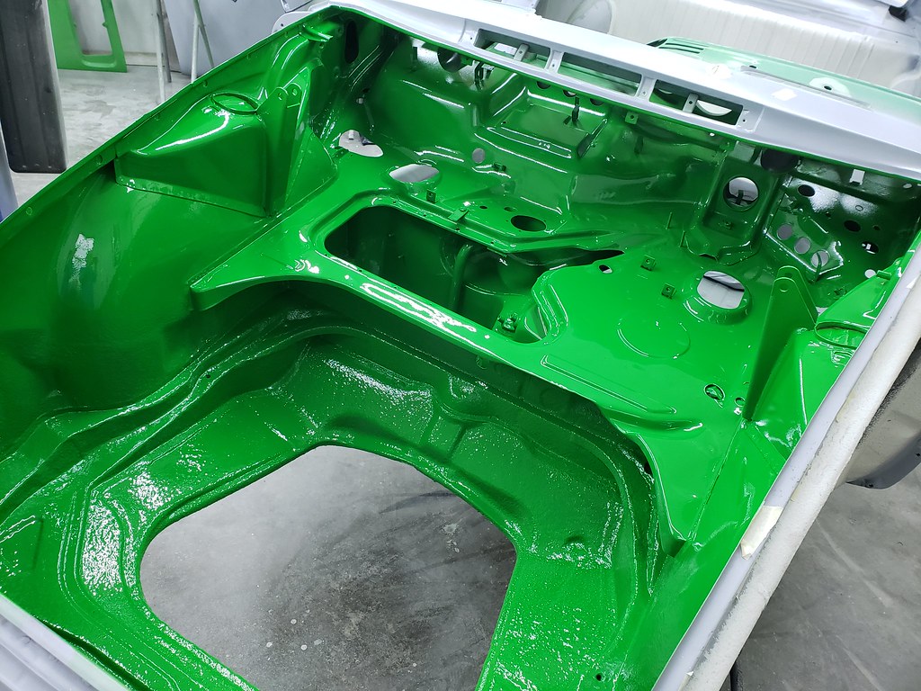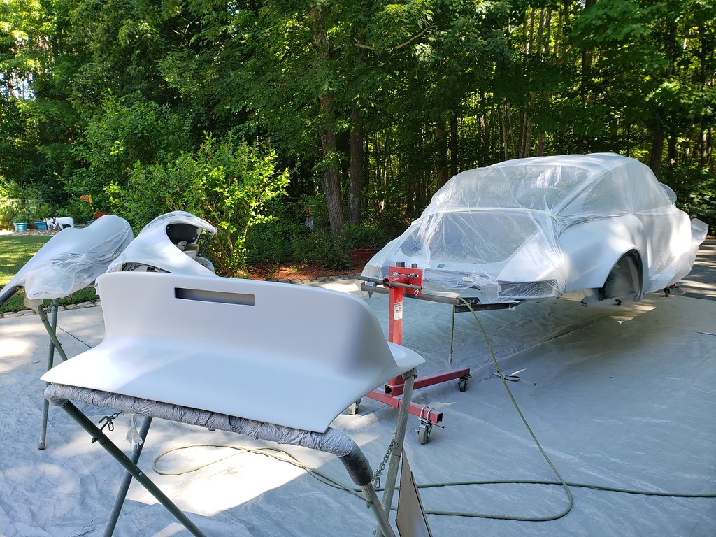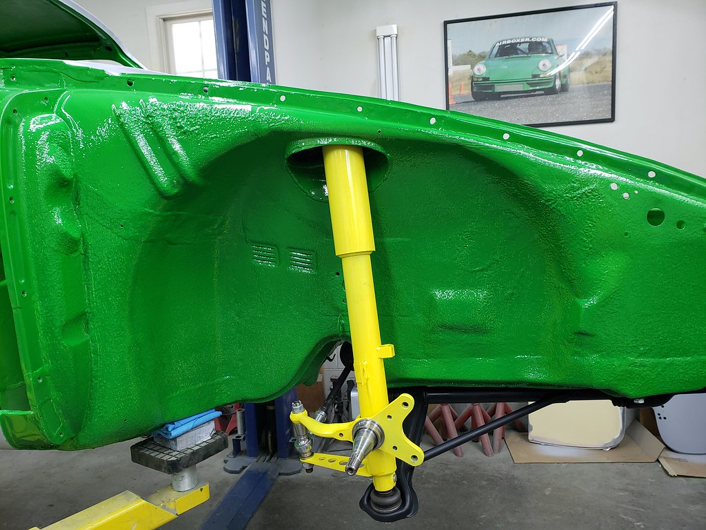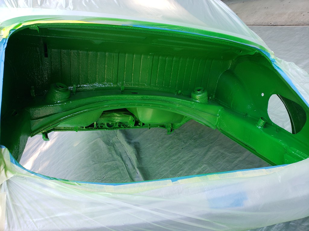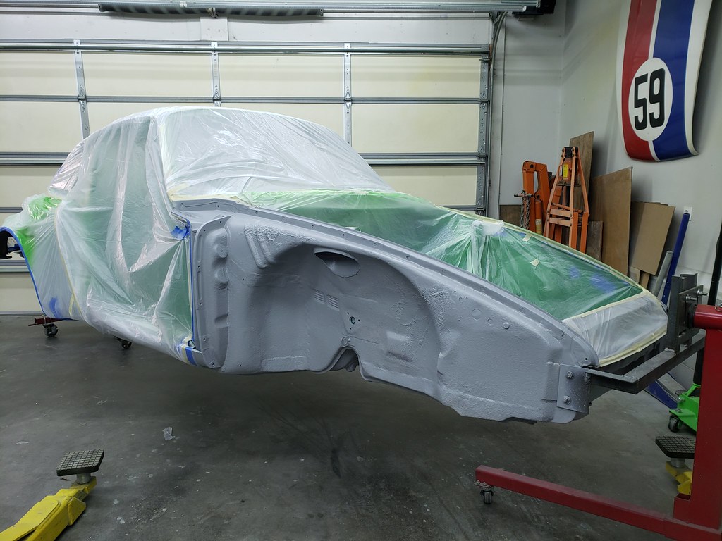 Before I could install any suspension parts I had to prime and paint the underside, trunk, engine bay and the inside. I used epoxy primer for the bare metal and some polyester primer for the fiber glass sections.