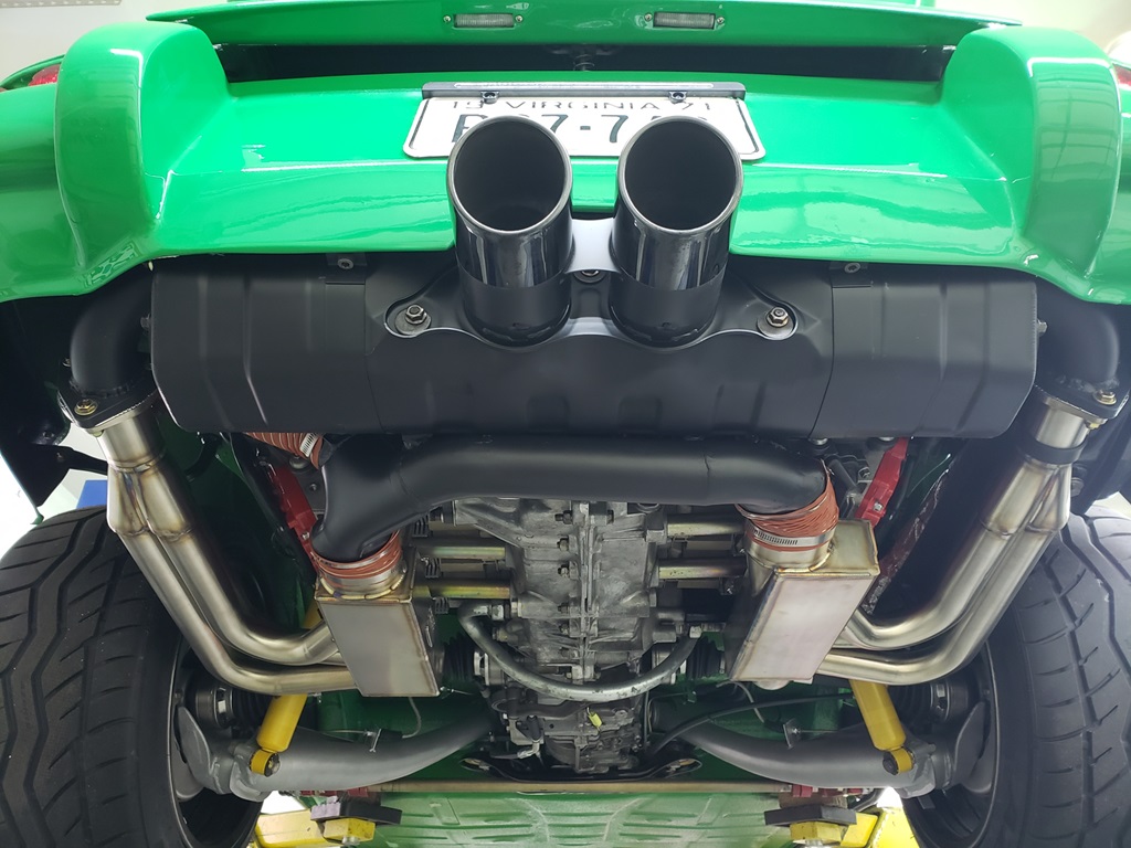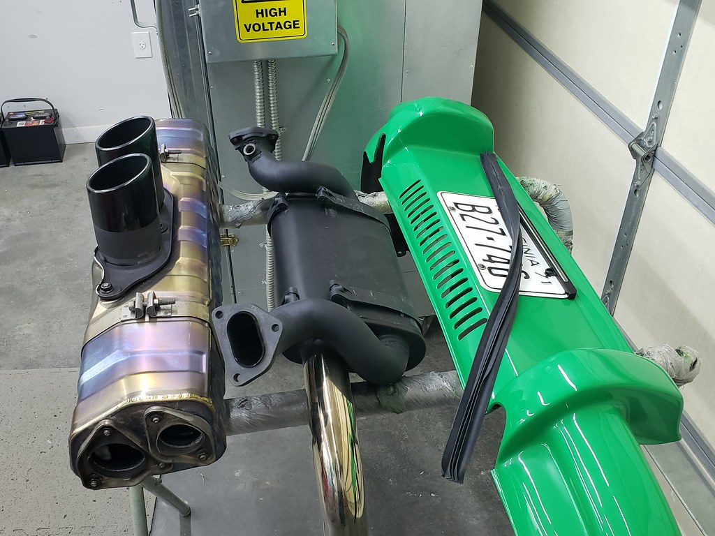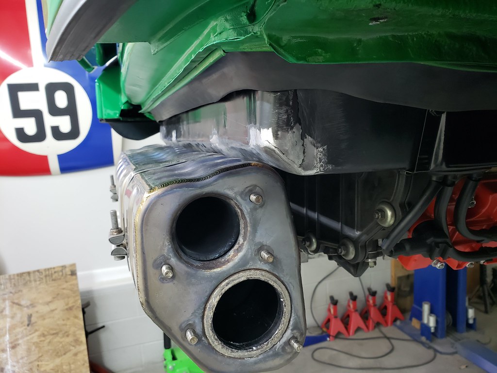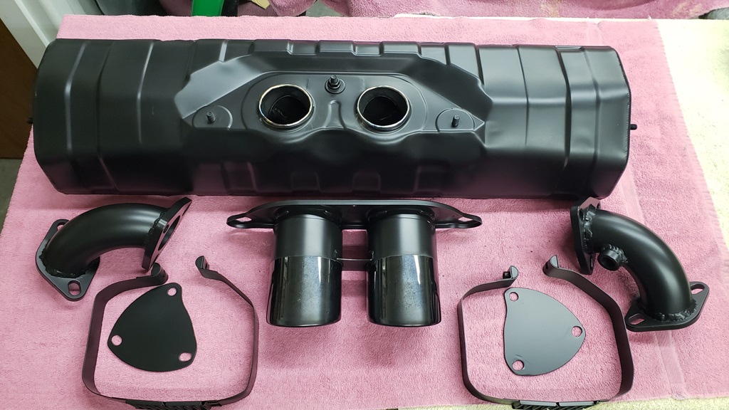 I also needed cross-over pipe for the heat, since I only have one side connected to the shroud. I used a 3.2L cross-over pipe and modified it a bit. Here are the muffler and pieces after blasting and coating with Crakote. Here is a view of the complete system installed. Here is a little sound clip after installation.