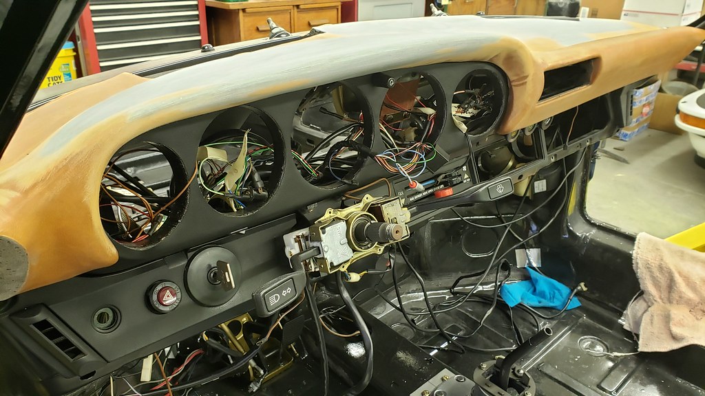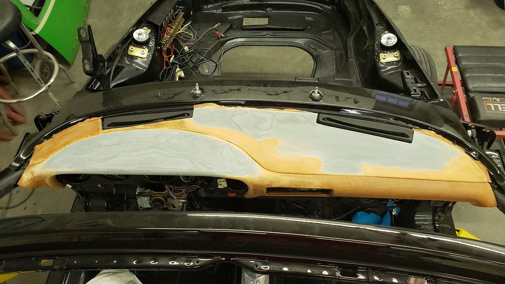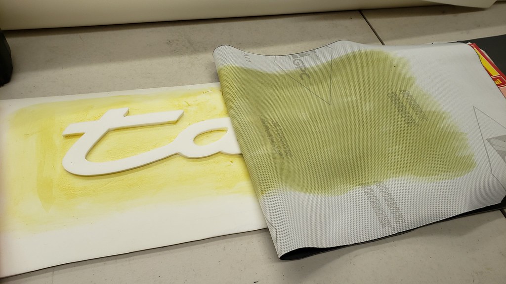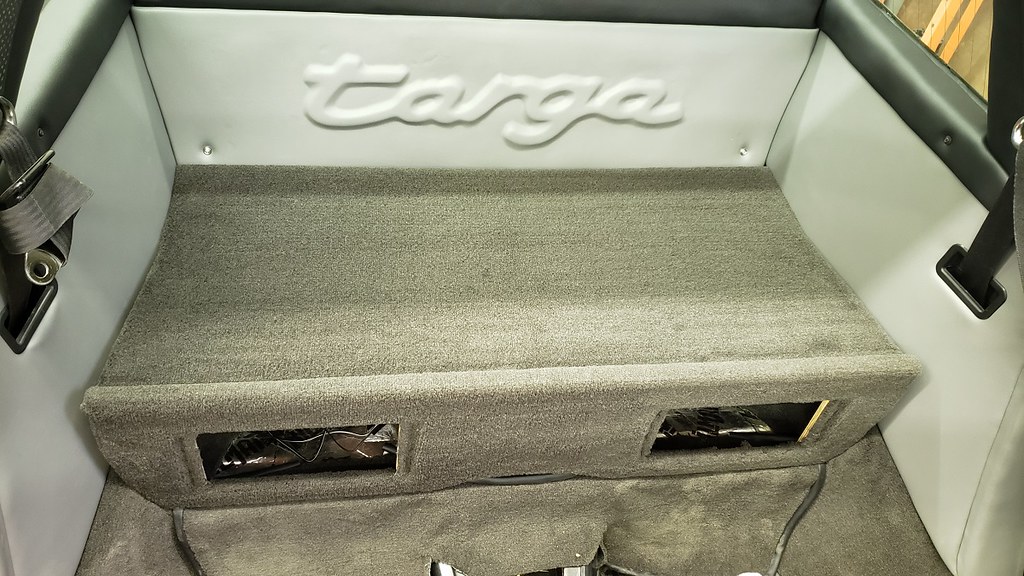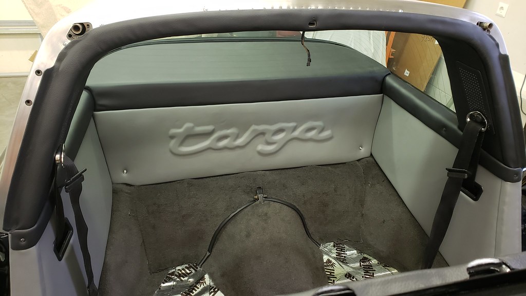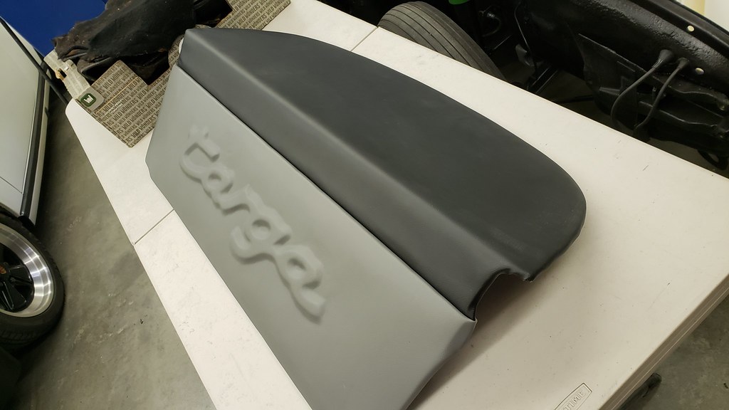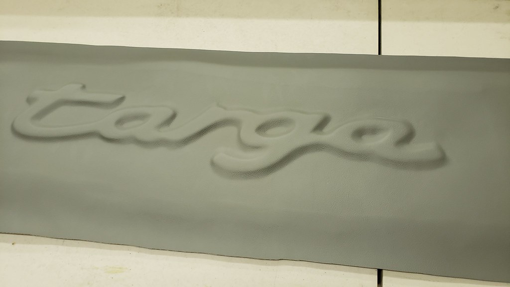 Next the rear shelf. It was also complete destroyed. So I made a new one from scratch. I wanted to try something new. So I cut the Targa script from vinyl and put it on the foam.