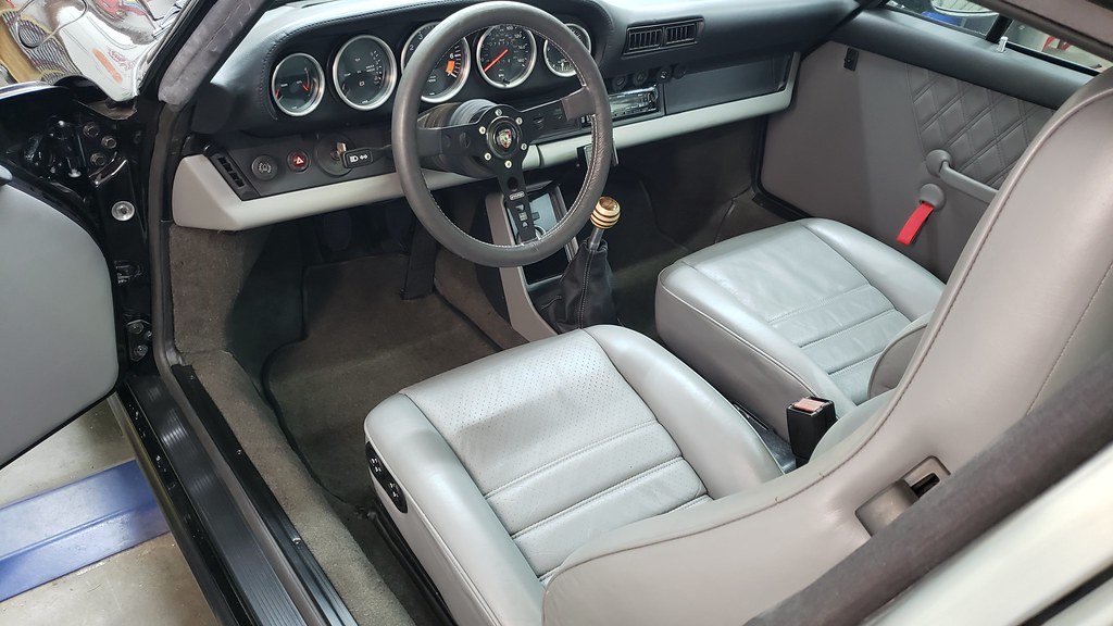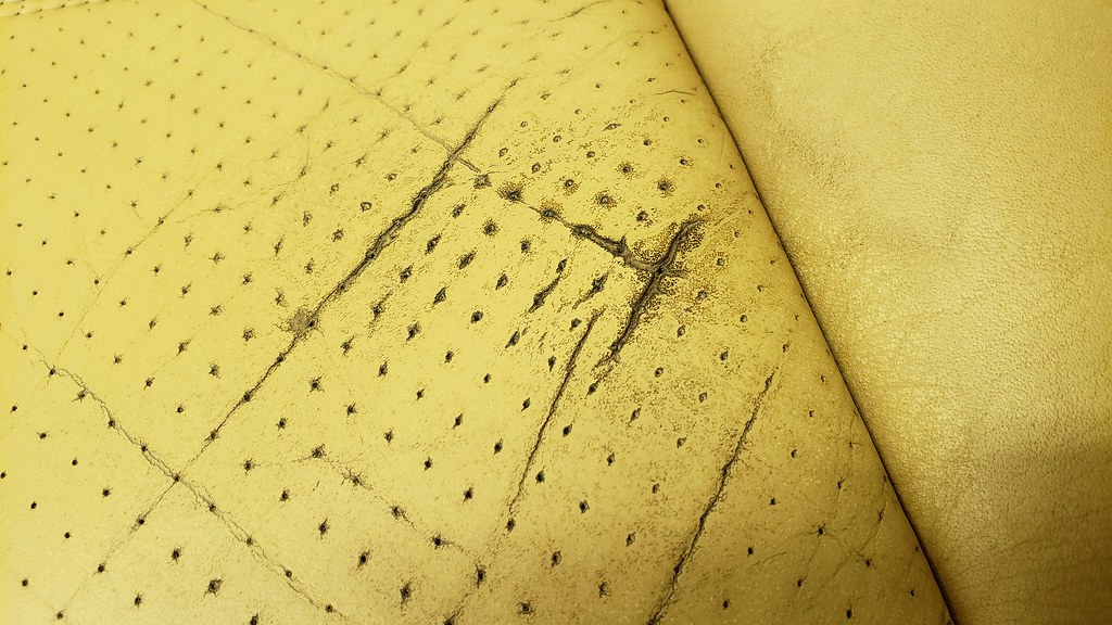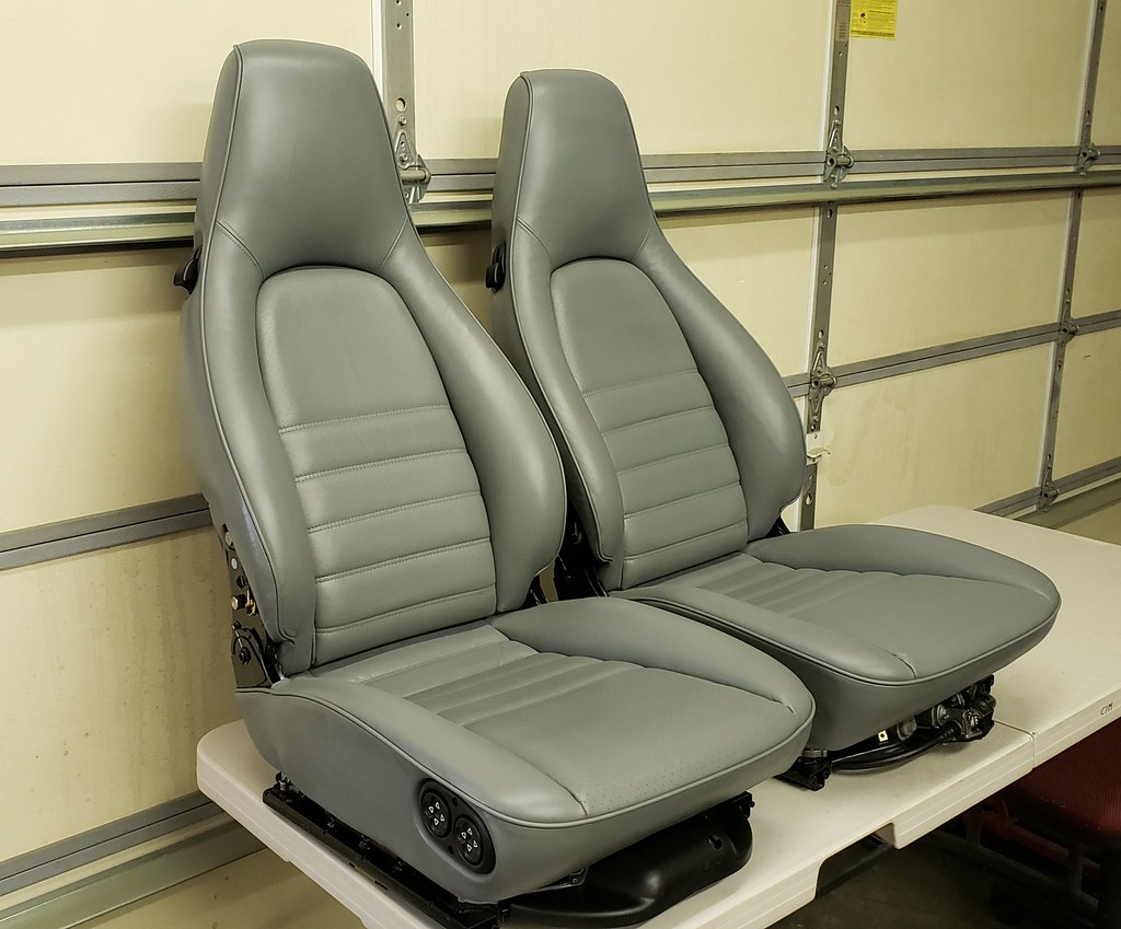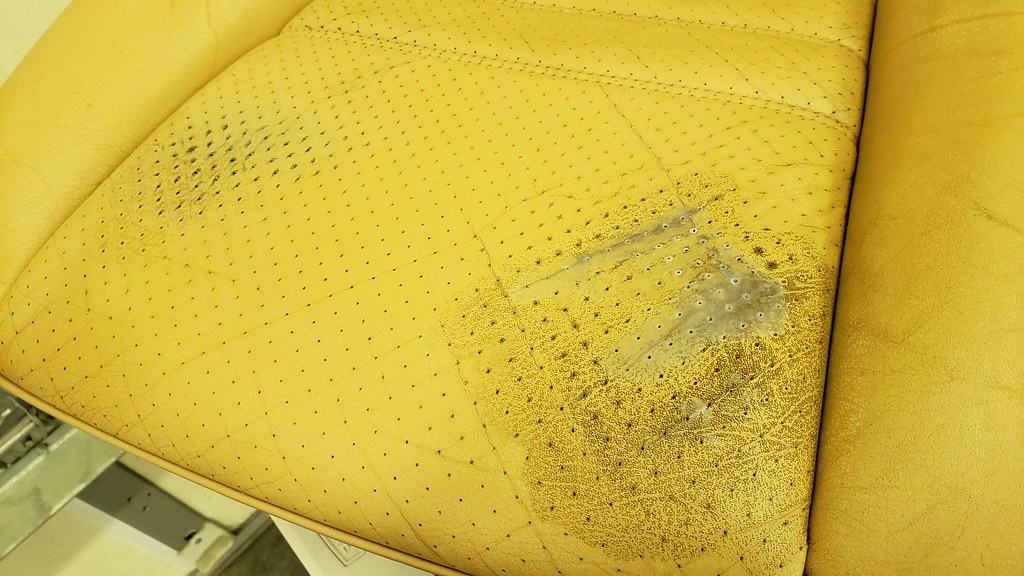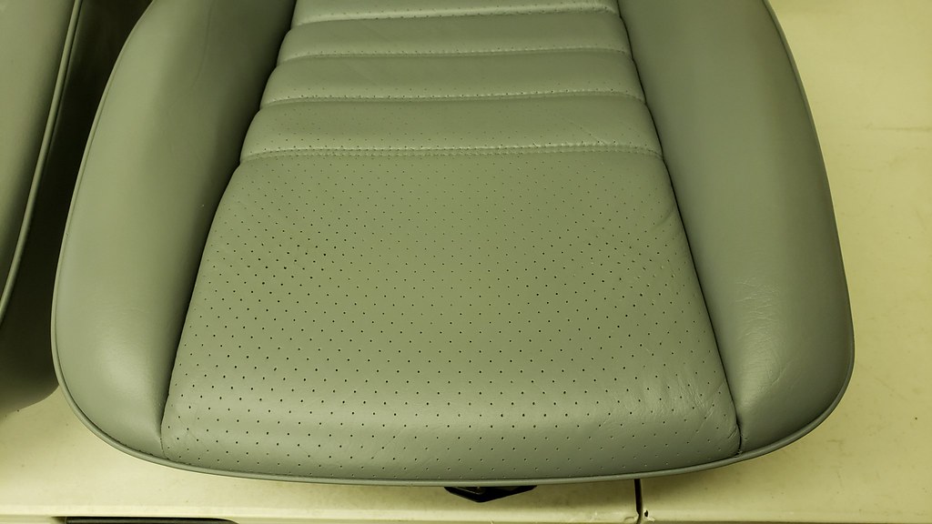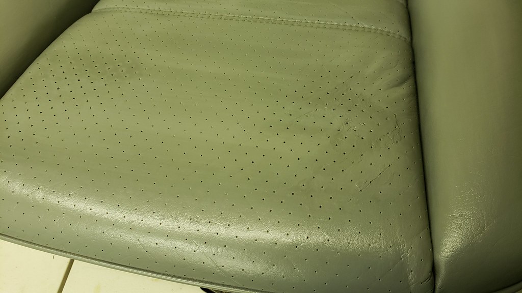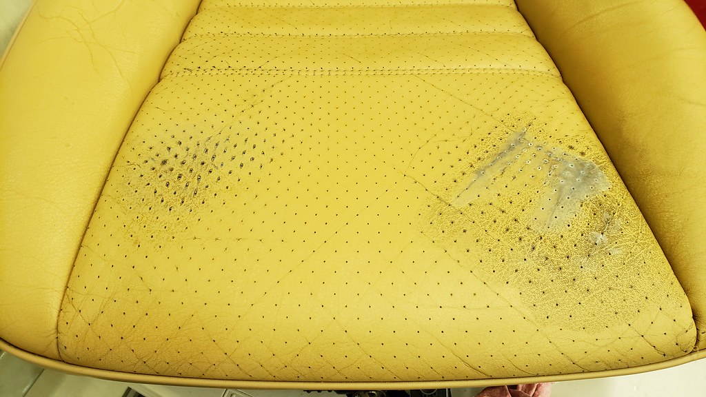 It was time to work on the seats. I found a nice set of 964 8-way power seats. The only thing was some wear on the driver seat. The pictures below show the leather already sanded and prepped, and ready for repair and dye.