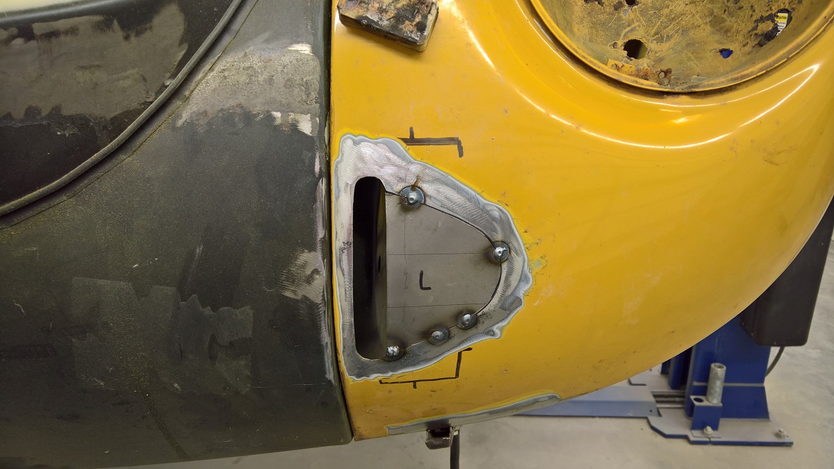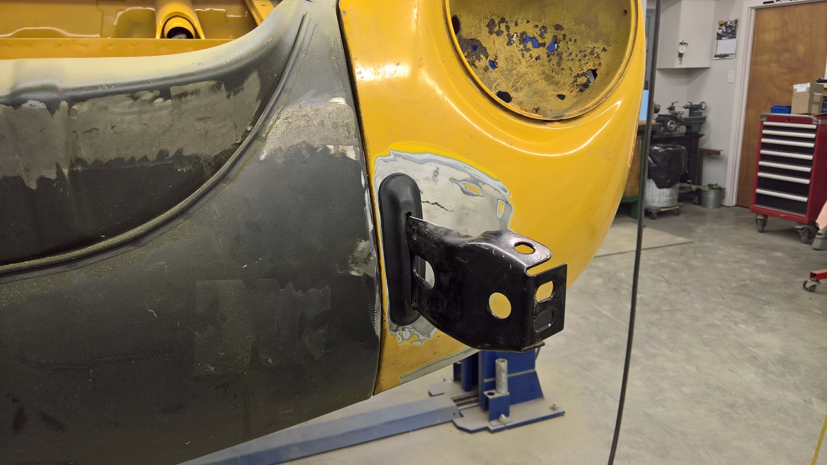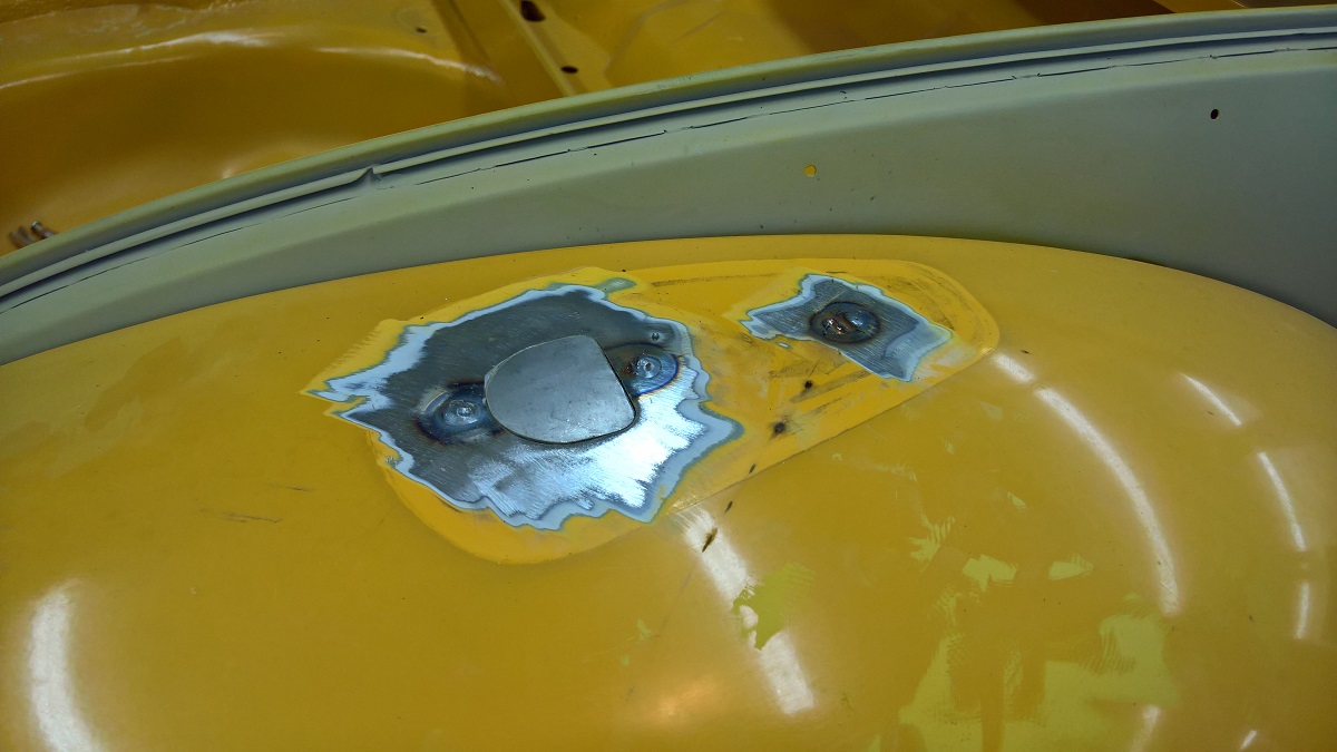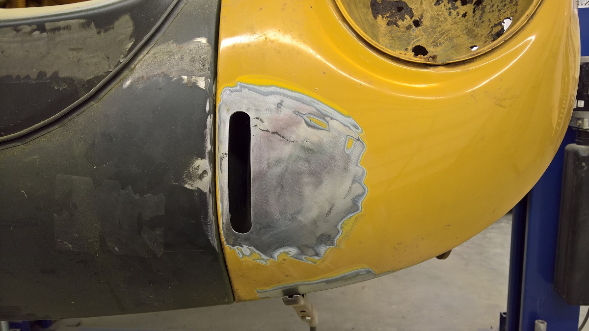 Now it was time to weld in some filler for the smaller bumper brackets, and found a layer of body filler.